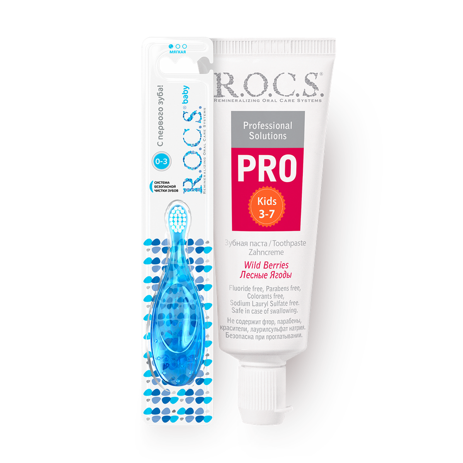 Зубная паста R.O.C.S. Pro Kids лесные ягоды, 45 g + Зубная щётка детская R.O.C.S. Baby 4-7 лет в ассортименте, 1 pc.