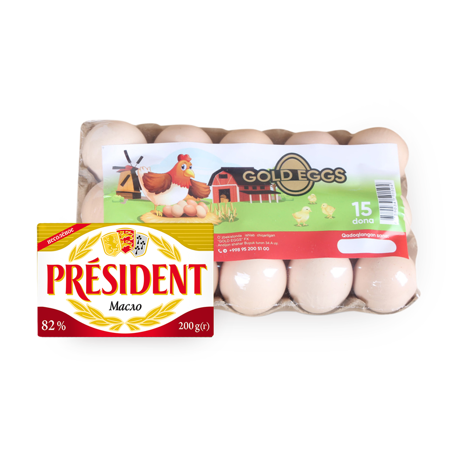 Сливочное масло 82% President, 200 g + Яйцо куриное Gold Eggs, 15 шт