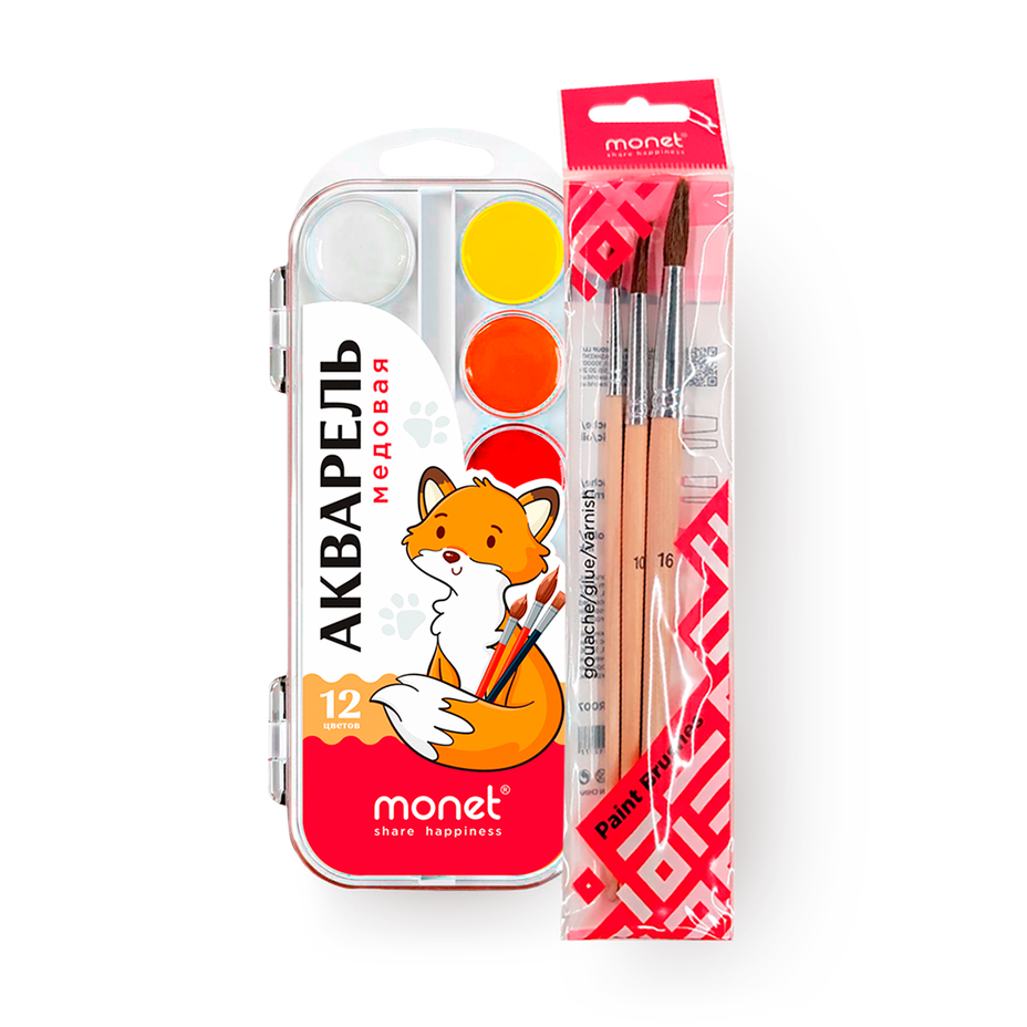 Набор кистей для рисования Monet круглые пони №4, 10, 16, 1 pc. + Краски акварельные Monet 12 цветов, 1 pc.