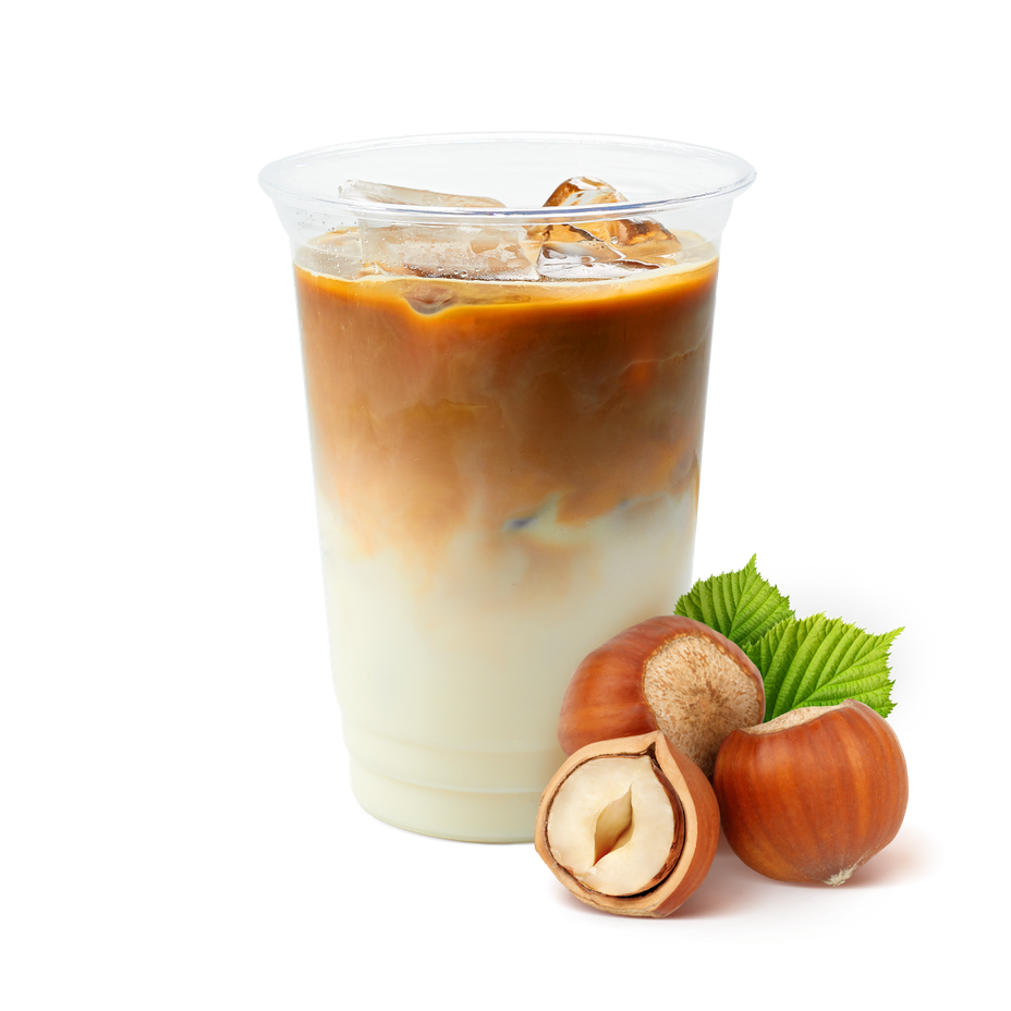 Этот холодный латте приготовили с ароматом лесного ореха. В нём сочетаются кофе арабика и молоко, которое делает вкус мягким.