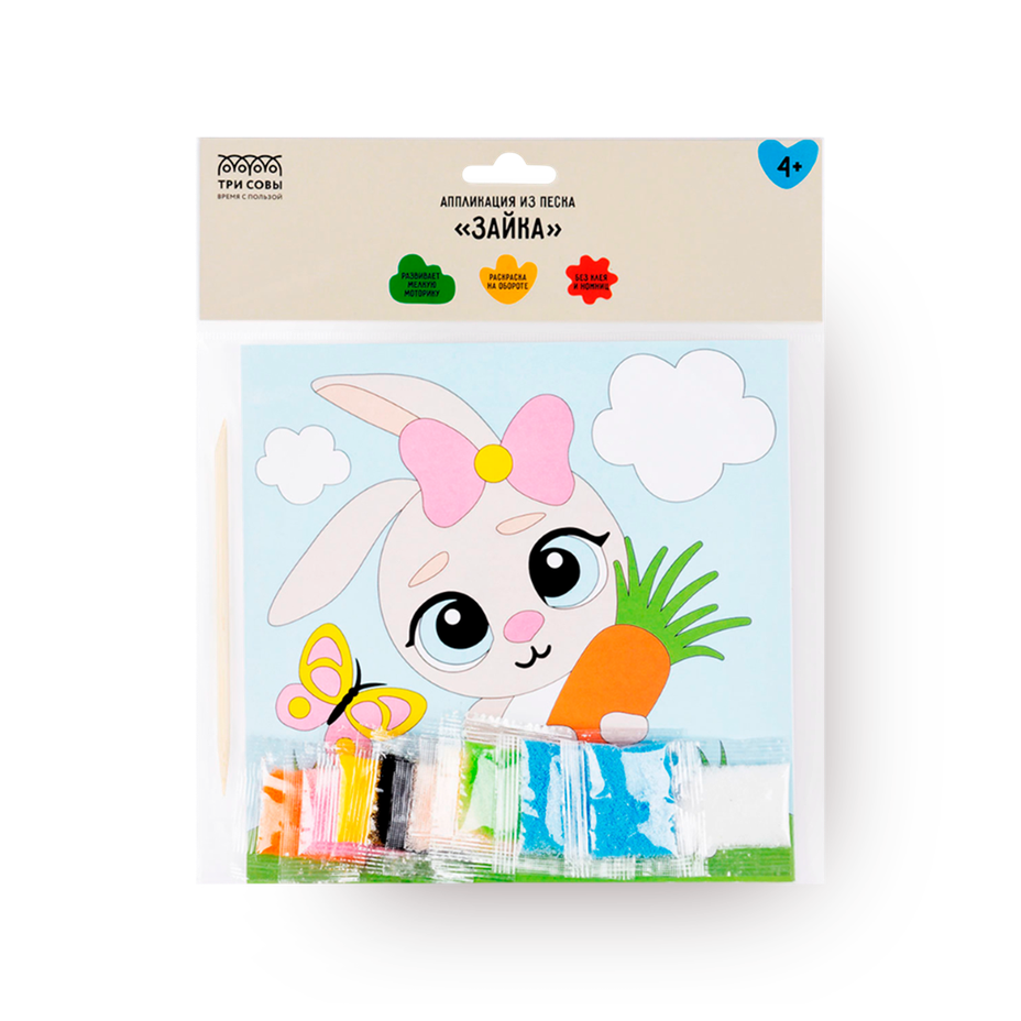 В наборе есть цветной песок и раскраска с зайкой. Можно создать яркую аппликацию или раскрасить картинку.