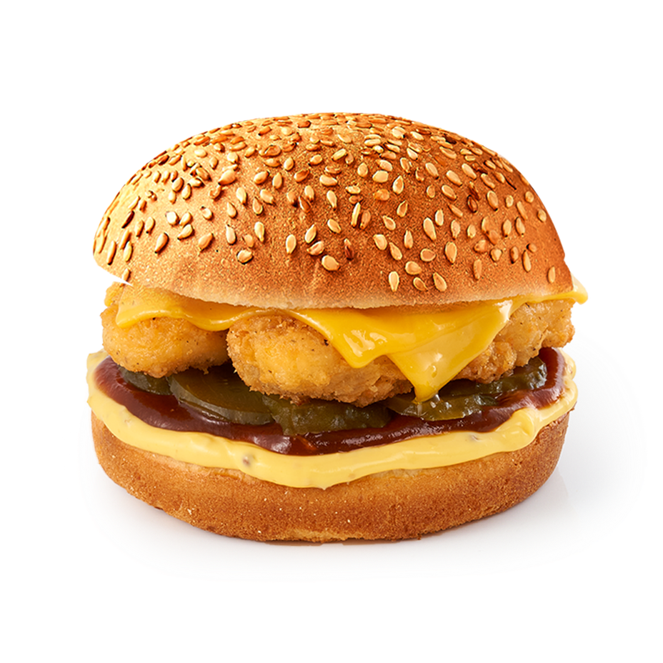 Булочка: Мука пшеничная хлебопекарная высшего сорта, мука пшеничная хлебопекарная первого сорта, вода питьевая, сахар, соль, масло растительное подсолнечное рафинированное дезодорированное, дрожжи хлебопекарные прессованные, клейковина пшеничная, семя кунжута, эмульгатор (эфиры глицерина, диацетилвинной и жирных кислот), антиокислитель (аскорбиновая кислота), антислеживающий агент (карбонат кальция), консервант (пропионат кальция). Соус медово-горчичный. Огурец соленый. Стрипсы: мясо курицы, мука пшеничная, стабилизатор Е1420, крахмал картофельный, кукурузный; масло подсолнечное, антиокислитель Е306; регулятор кислотности У451i, соль, сахар, глютен пшеничный, чеснок, перец белый, усилитель вкуса и аромата Е621, экстракт дрожжей, разрыхлители Е450i, E500ii; ароматизатор. Сыр полутвердый, масло сливочное, сухое молоко обезжиренное, концентрат молочного белка, пищевая добавка эмульгаторы (Е452, Е331, Е339), консервант сорбиновая кислота, краситель каротин, соль пищевая, вода питьевая. Соус барбекю.