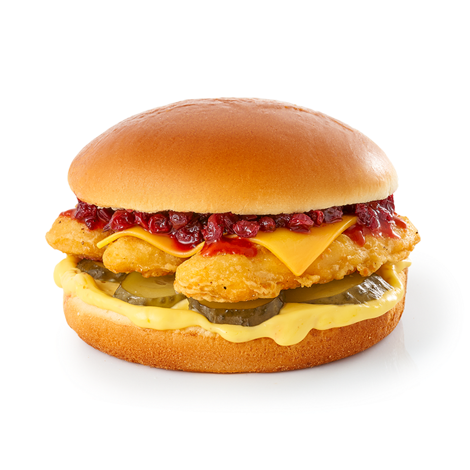 Этот бургер с курицей и медово-горчичным соусом получил остроту благодаря чесноку и перцу. В нём сочетаются хрустящий солёный огурец и нежная булочка с кунжутом.