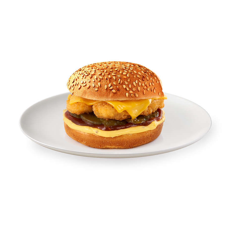 Этот бургер с куриными стрипсами и сырным соусом готов к употреблению. В нём сочетаются солёные огурцы и плавленый сыр.