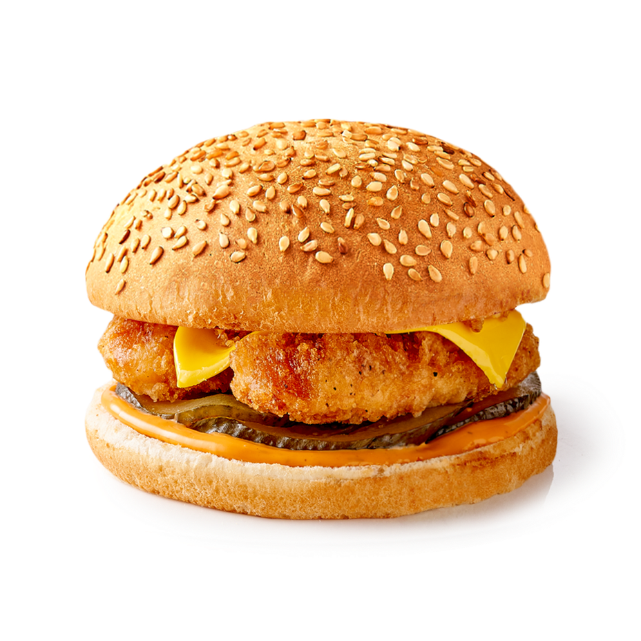 Этот бургер с куриными стрипсами и соусом 1000 островов готов к употреблению. В нём сочетаются хрустящие овощи и мягкая булочка с кунжутом.