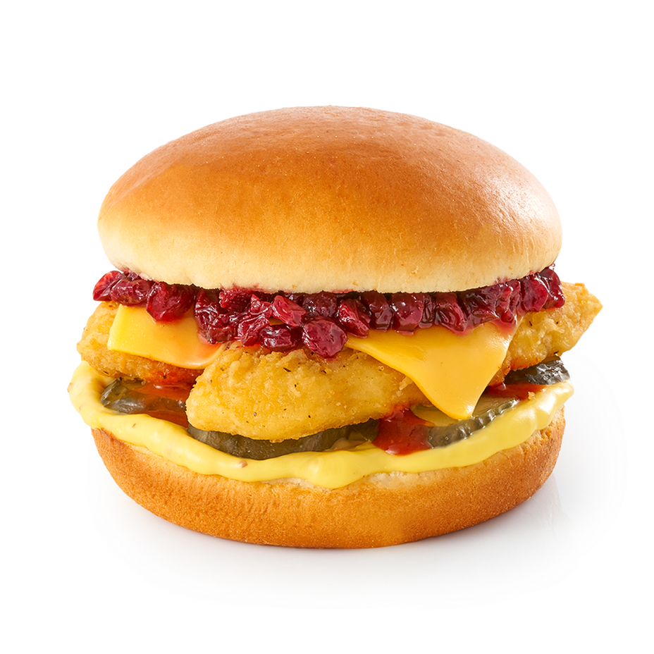 Булочка: Мука пшеничная хлебопекарная высшего сорта, мука пшеничная хлебопекарная первого сорта, вода питьевая, сахар, соль, масло растительное подсолнечное рафинированное дезодорированное, дрожжи хлебопекарные прессованные, клейковина пшеничная, семя кунжута, эмульгатор (эфиры глицерина, диацетилвинной и жирных кислот), антиокислитель (аскорбиновая кислота), антислеживающий агент (карбонат кальция), консервант (пропионат кальция). Соус шрирача: Перец чили 56%, чеснок, сахар, соль, очищенный уксус, консервант сорбат калия, стабилизатор ксантановая камедь. Соус брусничный: Вино красное сухое, брусника свежемороженная, сахар-песок, соус деми-глас, вода, соус карамельный (вода, сахар-песок, имбирь корень свежий, чеснок свежий, концентрат лимонного сока, соус табаско, соус соевый), крахмал кукурузный, вода. Соус медово-горчичный. Огурец солёный. Стрипсы: мясо курицы, мука пшеничная, стабилизатор Е1420, крахмал картофельный, кукурузный; масло подсолнечное, антиокислитель Е306; регулятор кислотности У451i, соль, сахар, глютен пшеничный, чеснок, перец белый, усилитель вкуса и аромата Е621, экстракт дрожжей, разрыхлители Е450i, E500ii; ароматизатор. Сыр полутвёрдый, масло сливочное, сухое молоко обезжиренное, концентрат молочного белка, пищевая добавка эмульгаторы (Е452, Е331, Е339), консервант сорбиновая кислота, краситель каротин, соль пищевая, вода питьевая. Вода, масло подсолнечное, загуститель Е1422, сахар, яичный желток, уксус столовый, соль, зёрна коричневой горчицы, оболочка горчицы, медовый порошок, специи и пряности (горчичный порошок, мускатный орех, корица, перец чёрный, семена сельдерея, перец белый, куркума), ароматизатор горчицы, регулятор кислотности: молочная кислота, лимонная кислота; краситель каротин, антиокислитель Е385.