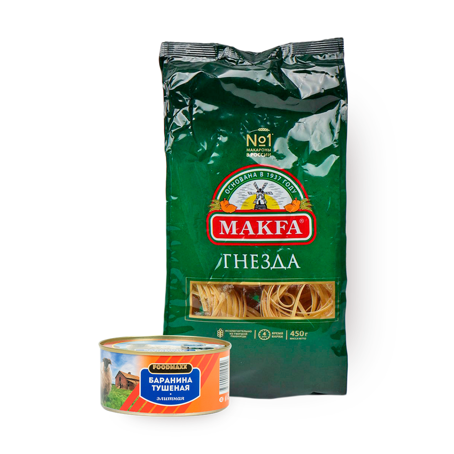 Макароны Гнёзда Тальятелле Makfa, 450 g + Тушёная баранина Foodmaxx Элитная, 325 g