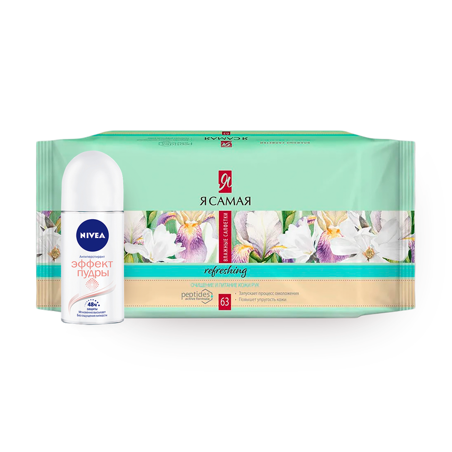 Дезодорант-антиперспирант Nivea Эффект пудры роликовый, 50 ml + Салфетки влажные «Я самая» освежающие зелёный чай с жасмином, 63 pc
