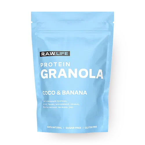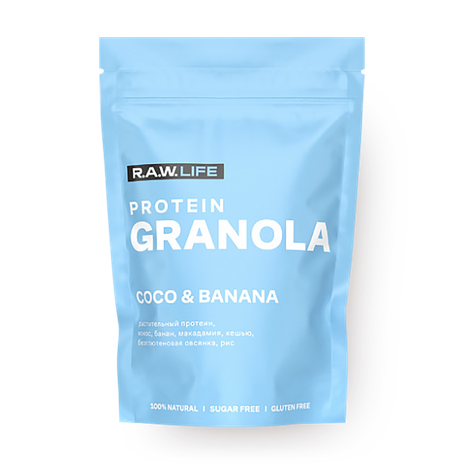 Эта гранола содержит на 2 грамма больше белка, чем обычная, и подходит для завтрака. В ней сочетаются банан и кокос, которые придают насыщенный вкус.