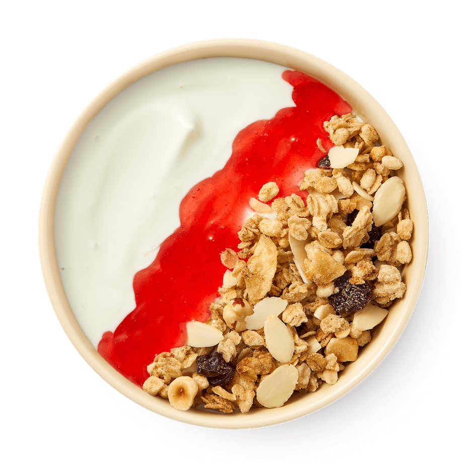 Гранола с хрустящими овсяными хлопьями и миндалем сочетается с нежным греческим йогуртом. Клубничный соус добавляет сладкую ноту, которая делает завтрак вкуснее.