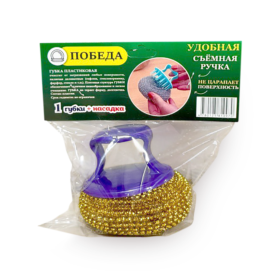 Эта губка сделана из пластика, который хорошо справляется с жиром и присохшими остатками пищи. В комплекте есть насадка, которая упрощает мытьё посуды.