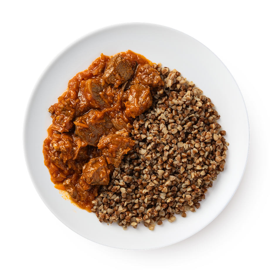 Гуляш из говядины с гречкой приготовили с морковью, луком и томатным соусом. Это блюдо можно разогреть и подать на обед или ужин.