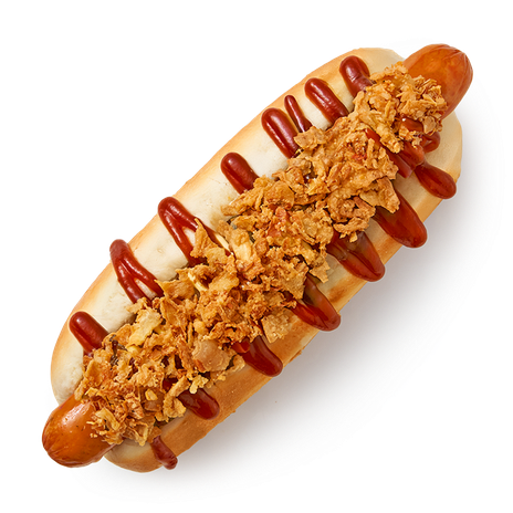 Булочка: мука пшеничная хлебопекарная высшего сорта, питьевая вода, сахар-песок, масло рапсовое, семена кунжута, соль поваренная пищевая, дрожжи хлебопекарные сухие инстантные, комплексная пищевая добавка – улучшитель хлебопекарный «Таленто Бан» (мука пшеничная хлебопекарная первый сорт, эмульгаторы (Е472е, Е481), агент антислеживающий Е170, антиокислитель Аскорбиновая кислота, ферментные препараты) глютен пшеничный, консервант Е-282, антиокислитель Аскорбиновая кислота. Сосиска: Мясо говядины, жир говяжий, яйцо, сухое молоко, НПС, сахар, специи. Соус медово-горчичный: Вода, масло подсолнечное, загуститель Е1422, сахар, яичный желток, уксус столовый, соль, зерна коричневой горчицы, оболочка горчицы, медовый порошок, специи и пряности (горчичный порошок, мускатный орех, корица, перец чёрный, семена сельдерея, перец белый, куркума (ароматизатор горчицы, регулятор кислотности: молочная кислота, лимонная кислота; краситель каротин, антиокислитель Е385. Соус барбекю: вода, сироп глюкозно-фруктозный, томатная паста, уксус столовый, загуститель Е1422, соль, ароматизатор Хикори, натуральный краситель сахарный колер III, лук, перец чили, перец чили копчёный, регулятор кислотности молочная кислота, консервант сорбиновая кислота, подсластитель сахарин (натриевая соль). Лук, растительное масло, пшеничная мука, соль.