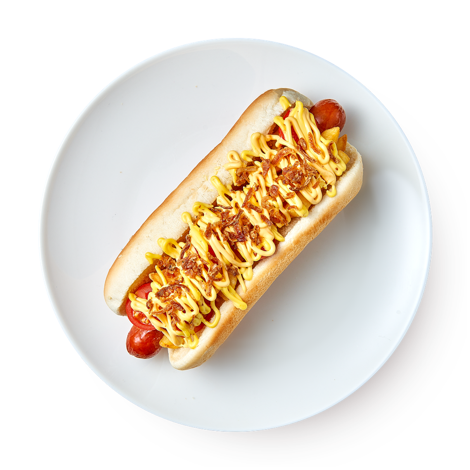 Этот хот-дог с говяжьей колбаской дополнен картофелем фри и свежими томатами. Его можно взять с собой или съесть сразу, пока он горячий.