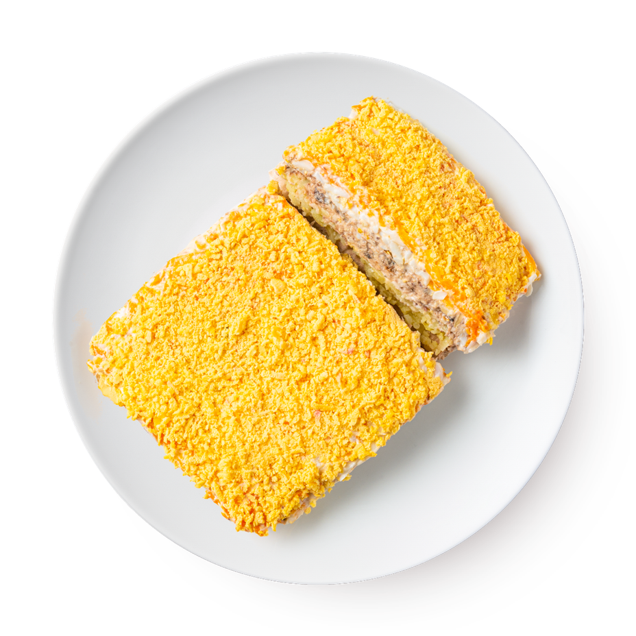 Шпроты консервированные, картофель, морковь, яичный меланж (куриный), лук репчатый, сыр, майонез.