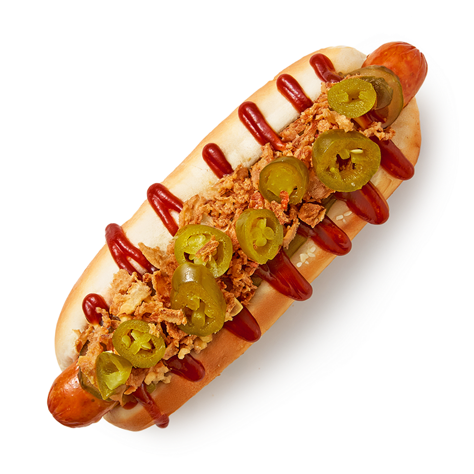 Мука пшеничная хлебопекарная высшего сорта, питьевая вода, сахар-песок, масло рапсовое, семена кунжута, соль поваренная пищевая, дрожжи хлебопекарные сухие инстантные, комплексная пищевая добавка - улучшитель хлебопекарный «Таленто Бан» (мука пшеничная хлебопекарная первый сорт, эмульгаторы (Е472е, Е481), агент антислеживающий Е170, антиокислитель Аскорбиновая кислота, ферментные препараты), глютен пшеничный, консервант Е282, антиокислитель Аскорбиновая кислота. Сосиска: мясо птицы, жир, яйцо, сухое молоко, сахар, специи. Соус: вода, масло подсолнечное, загуститель Е1422, сахар, яичный желток, уксус столовый, соль. Зёрна коричневой горчицы, оболочка горчицы, медовый порошок, специи и пряности (горчичный порошок, мускатный орех, корица, перец чёрный, семена сельдерея, перец белый, куркума, ароматизатор горчицы, регулятор кислотности: молочная кислота, лимонная кислота; краситель каротин, антиокислитель Е385. Вода, сироп глюкозно-фруктозный, томатная паста, уксус столовый, загуститель Е1422, соль, ароматизатор Хикори, натуральный краситель сахарный колер III, лук, перец чили, перец чили копчёный, регулятор кислотности молочная кислота, консервант сорбиновая кислота, подсластитель сахарин (натриевая соль). Огурцы, соль, чеснок, пряности, вода. а, вода, посолочно-нитритная смесь, соль поваренная пищевая, фиксатор окраски Е250), регулятор кислотности Е451I, Е451II, стабилизатор Е451III, сахар-песок, усилитель вкуса и аромата E621, антиокислитель Е300, паприка. Лук, растительное масло, пшеничная мука, соль. Перец халапеньо резаный, консервированный.