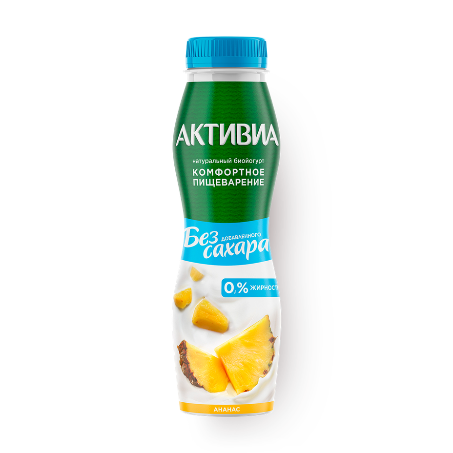 Нормализованное молоко, восстановленное молоко из сухого молока, наполнитель (ананас, вода, сахар, кукурузный крахмал, сок лимона концентрированный, загуститель - пектины, ароматизатор натуральный), сахар, йогуртовая закваска, бифидобактерии ActiRegularis.