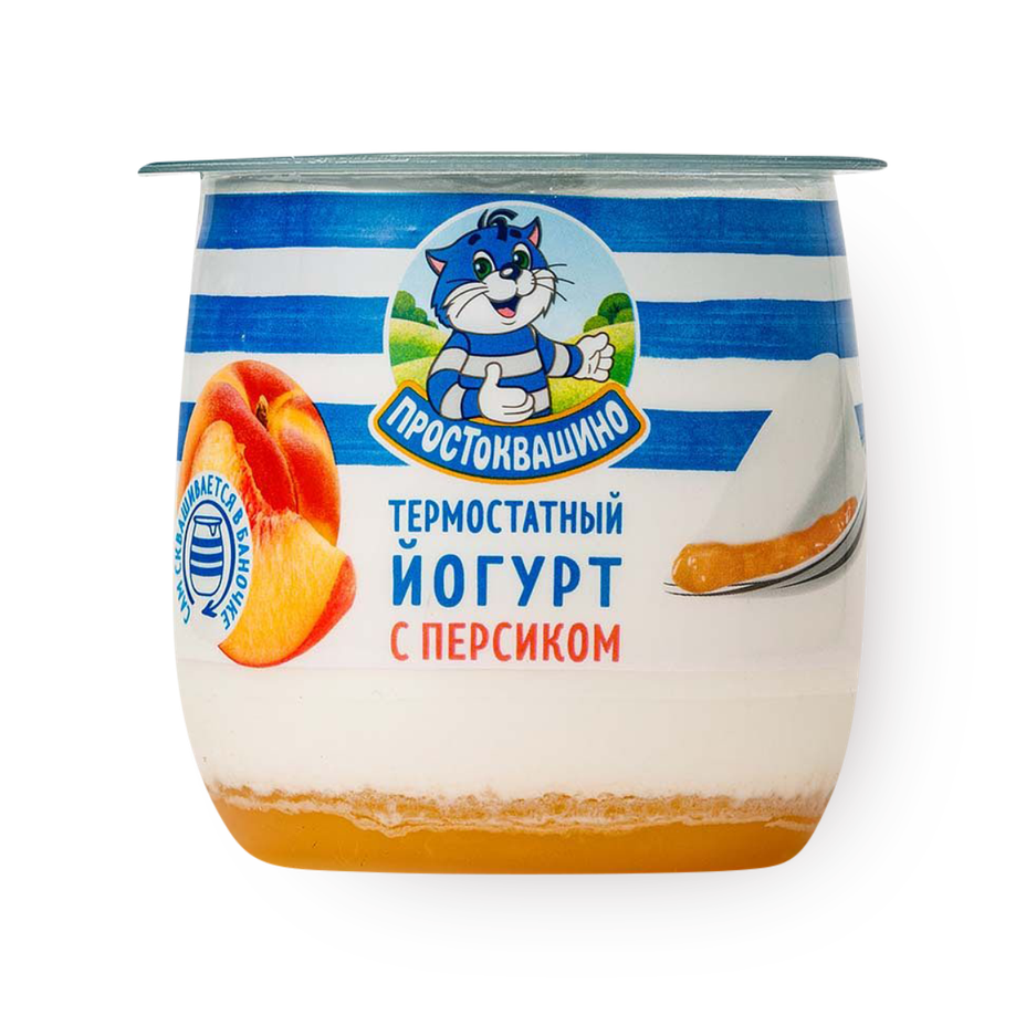Этот йогурт приготовили термостатным способом, который сохраняет нежную текстуру. В нём сочетаются сливочный вкус и сладкие кусочки персика.