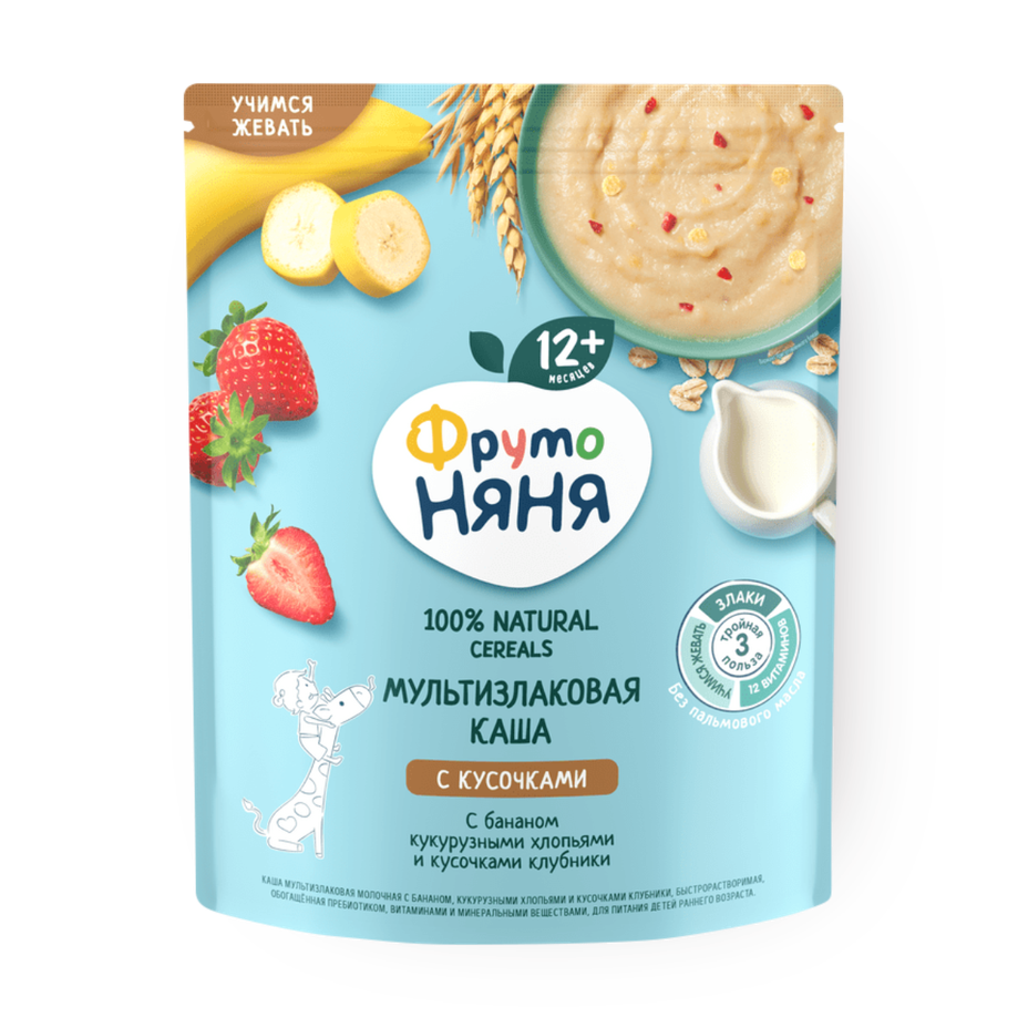 Каша молочная мультизлаковая «Фрутоняня» банан-клубника-кукурузные хлопья