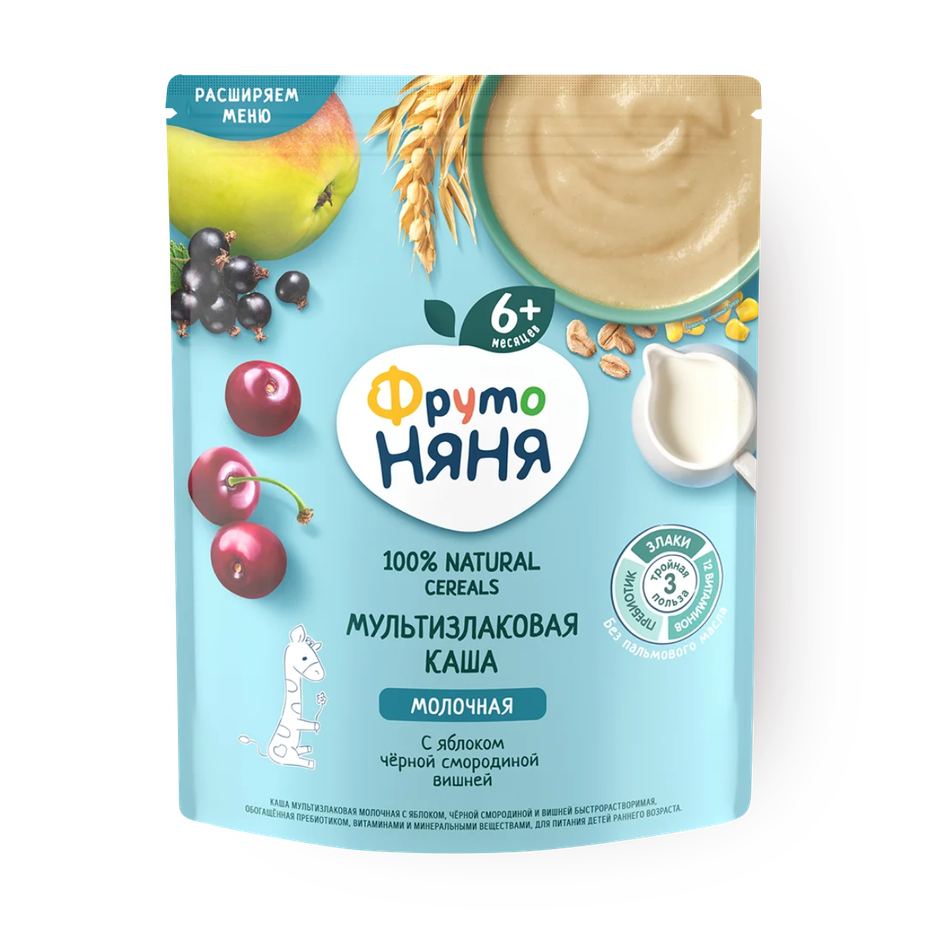 Молочная каша с яблоком, чёрной смородиной и вишней подходит для малышей с 6 месяцев. В ней сочетаются разные злаки, которые делают вкус насыщенным.