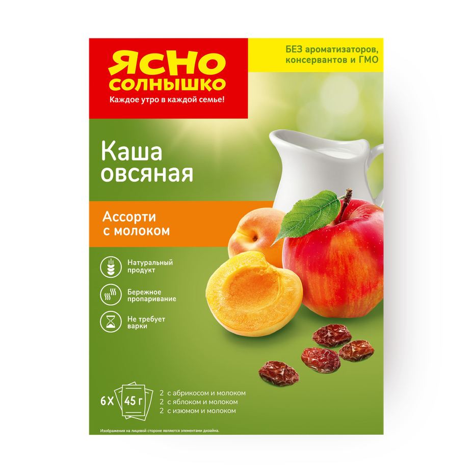 Каша овсяная без варки «Ясно Солнышко» ассорти (с молоком, с абрикосом, изюмом, яблоком) 6 шт.