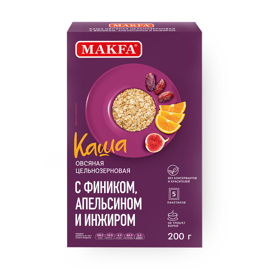 Каша овсяная цельнозерновая Makfa с фиником, апельсином и инжиром на фруктозе порционная 5 шт.