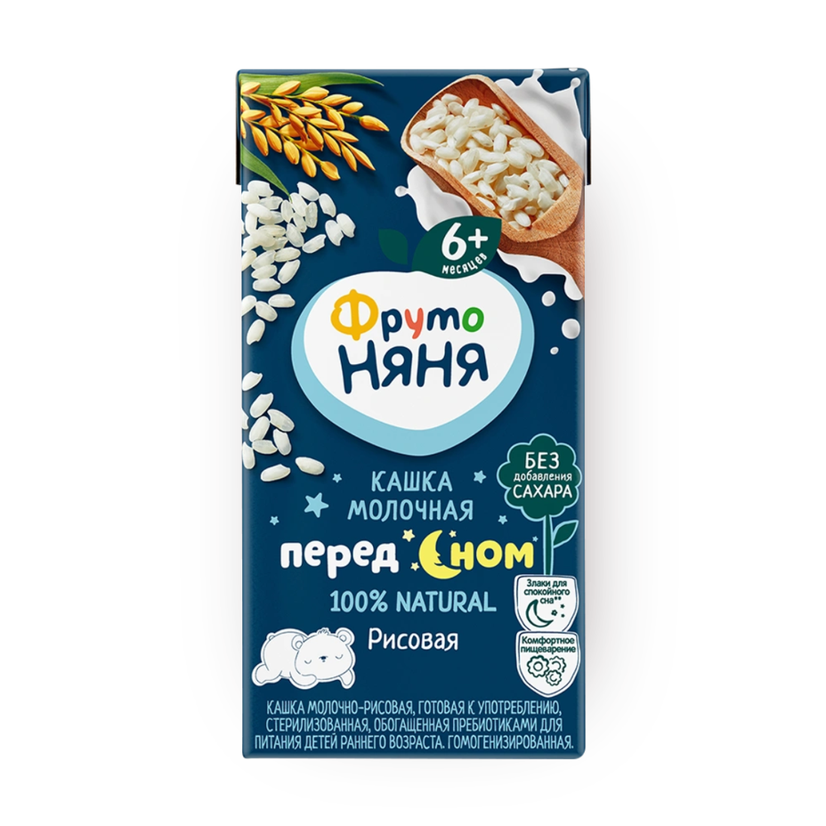 Рисовая кашка на молочной основе подходит для детей с 6 месяцев. В составе есть пребиотик, который поддерживает пищеварение.