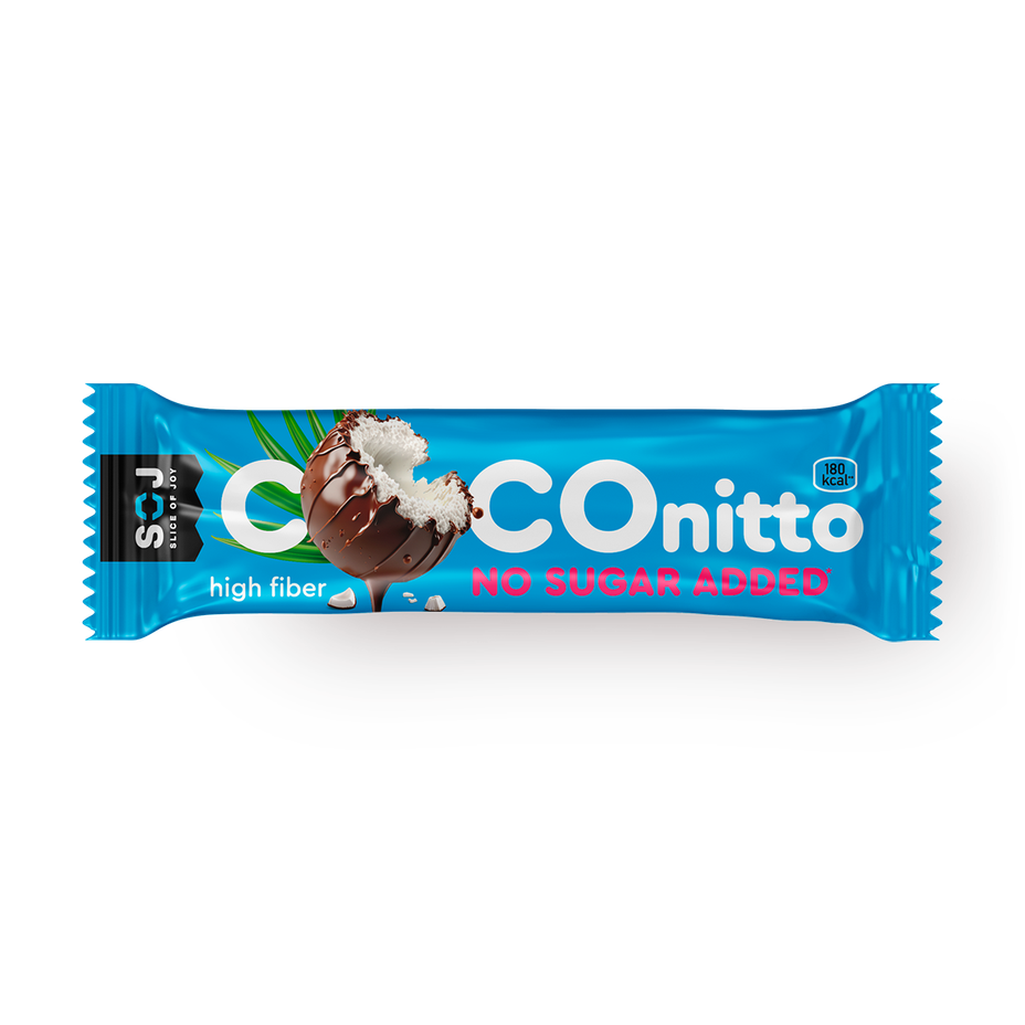 Этот батончик содержит кокосовую стружку и молочный шоколад без сахара. Его можно взять с собой в качестве перекуса после тренировки.
