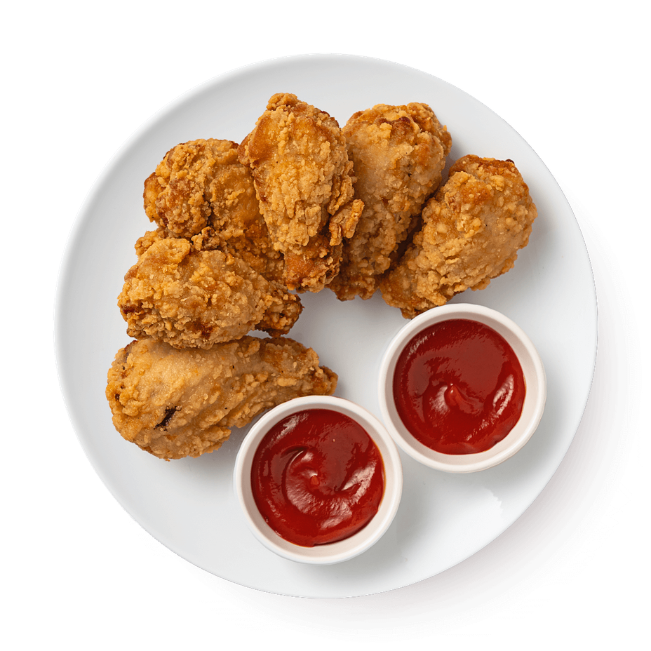Плечевые части крыльев тушек цыплят-бройлеров замороженные, вода питьевая, масло растительное подсолнечное рафинированное дезодорированное, смеси панировочные (мука пшеничная, сухари панировочные (пшеничная мука, вода питьевая, соль, дрожжи), соль, усилитель вкуса и аромата глутамат натрия 1-замещённый специи и пряности молотые (перец белый, перец чёрный, чеснок порошок, лук порошок, лавровый лист, тимьян, сельдерей), белок яичный сухой, мальтодекстрин, загуститель Е1422, ароматизаторы дрожжевой экстракт, регулятор кислотности лимонная кислота, разрыхлители (гидрокарбонат натрия, дигидропирофосфат натрия), крахмал пшеничный, глютен пшеничный, краситель экстракт паприки), дестроза, мальтодекстрин.