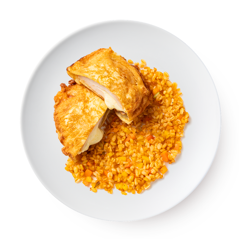 Куриная грудка, сыр, мучной кляр, яйца, масло растительное, булгур, морковь, кабачки, паприка, лимон, соль, перец черный.