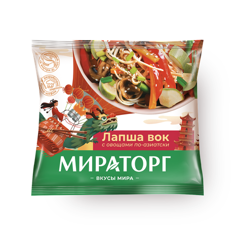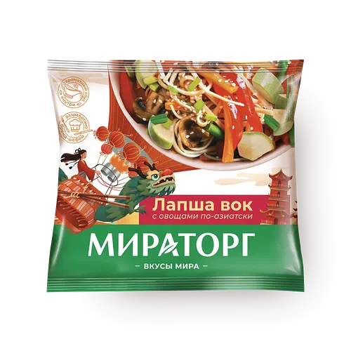 Лапша (вода питьевая, крупа манная из твердых сортов пшеницы, масло растительное, соль, куркума порошок), кабачок, шампиньоны, перец сладкий, фасоль стручковая, морковь, лук, азиатский соус (пальмовое масло, соус соевый (семена сои, соль, уксус спиртовой), вода питьевая, сахар, уксус спиртовой, сок лайма концентрированный, имбирь, ароматиза - торы натуральные, соль, перец кайенский измельченный, чеснок измельченный, загусти - тель ксантановая камедь). На предприятии используются продукты переработки рыбы, ракообразных, моллюсков, молока, сои, горчицы и сельдерея.