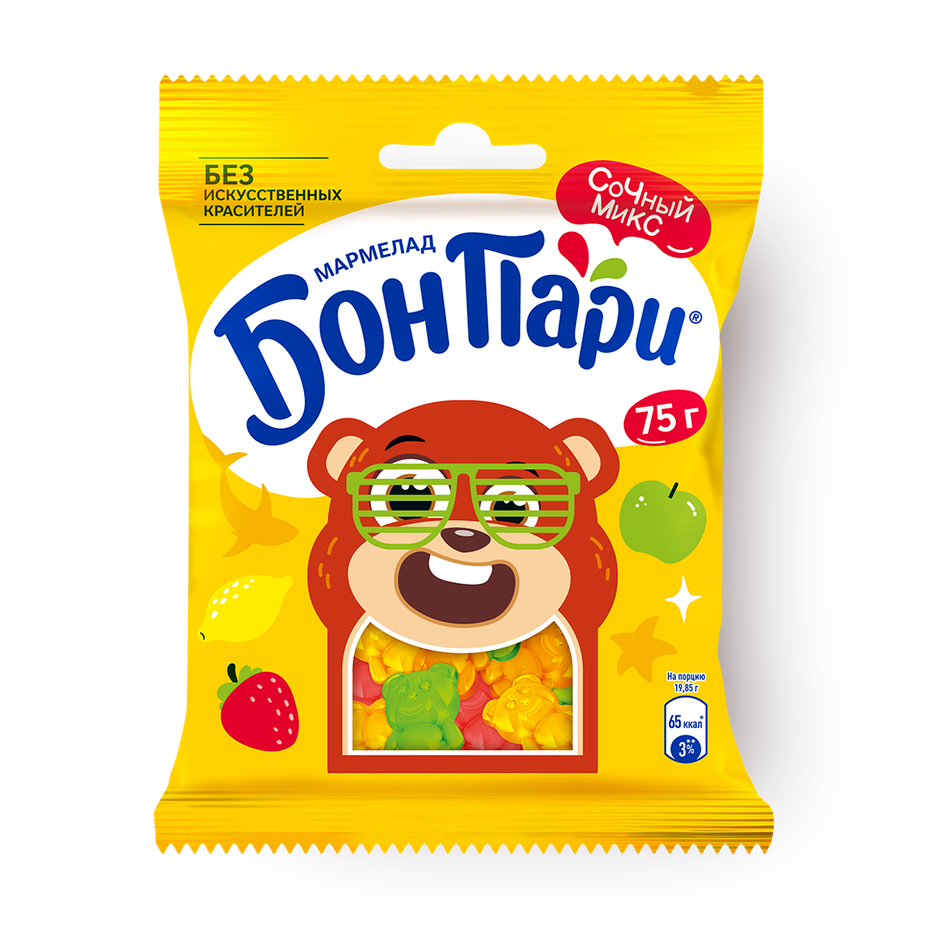 Этот мармелад в виде медвежат имеет сладкий фруктовый вкус. Его можно взять с собой в школу или на прогулку.