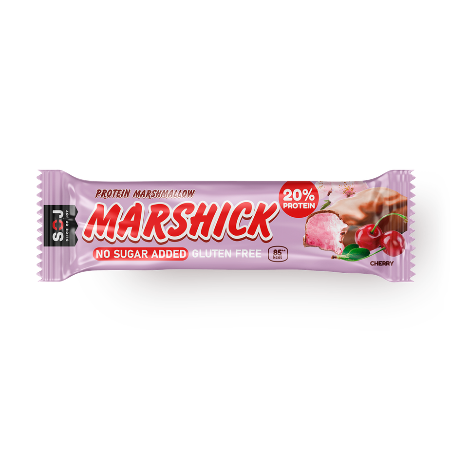 Маршмеллоу с вишнёвым вкусом подойдёт в качестве перекуса или дополнения к чаю. В составе есть молочный шоколад, который придаёт сладость без сахара.