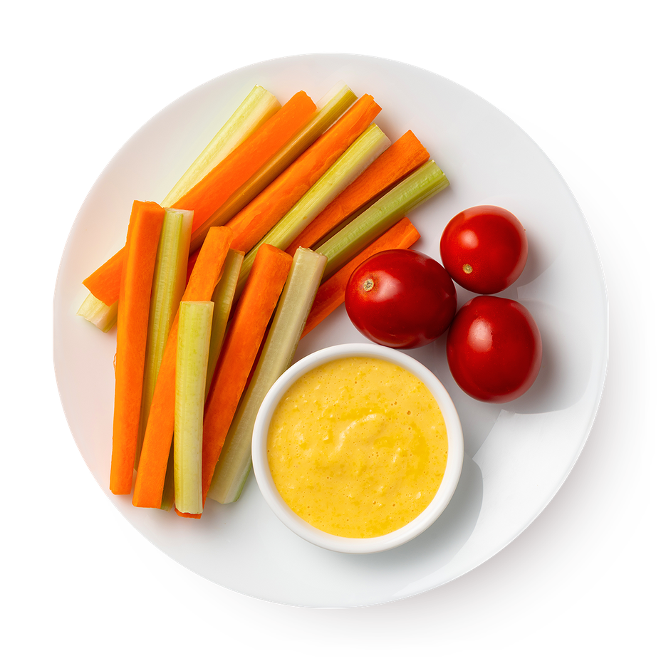 Сельдерей, морковь, помидоры черри, соус кукурузный Айоли (кукуруза консервированная, масло растительное, яйца куриные, лимон, чеснок, соль).