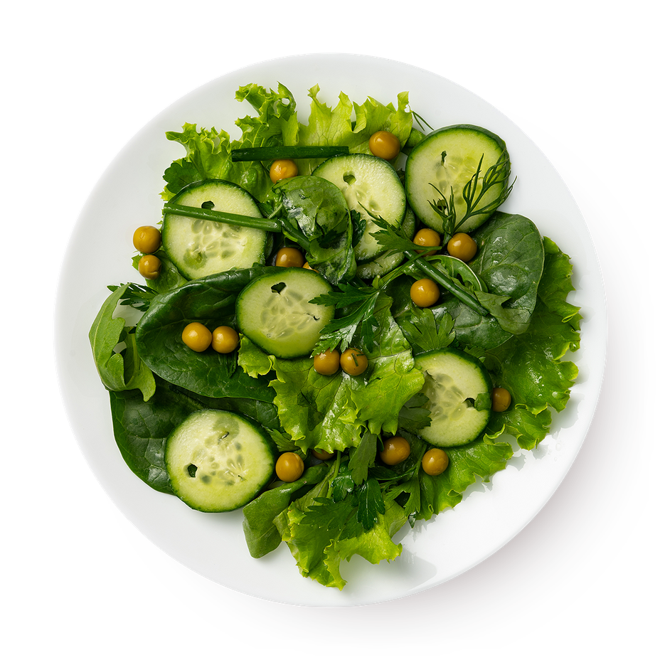 Огурцы, шпинат, латук, горошек консервированный, соус (масло растительное, вода, лимон, горчица зернистая, уксус винный, соль, сахар, перец чёрный молотый), рукола, петрушка, укроп, лук зелёный.