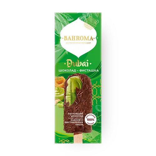 Мороженое (молоко цельное, масло сливочное, сахар, молоко сухое обезжиренное, патока крахмальная, молоко цельное сгущённое с сахаром (молоко цельное, сахар: сахароза, лактоза), вода питьевая, паста из ядер орехов фисташки обжаренных, сухой глюкозный сироп, мальтодекстрин, эмульгатор моно- и диглицериды жирных кислот, стабилизаторы (камедь рожкового дерева, гуаровая камедь, каррагинан), ароматизатор, красители (медные комплексы хлорофиллинов, куркумин)); молочный шоколад (сахар, какао тёртое, масло какао, молоко сухое цельное, сухая молочная сыворотка, молочный жир, эмульгаторы (лецитин соевый, Е476), ароматизатор); начинка фисташковая (сахар, масла растительные (масло подсолнечное, масло кокосовое), паста фисташковая, молоко сухое обезжиренное, сухая молочная сыворотка, концентраты (спирулины, сафлора, лимона и яблока), эмульгатор лецитин из подсолнечника, ароматизатор); тесто кадаиф (мука пшеничная, вода питьевая).