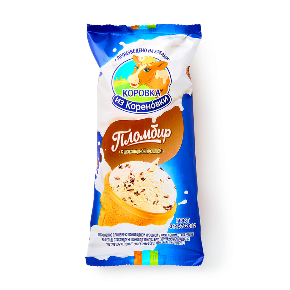 Мороженое пломбир «Коровка из Кореновки» с шоколадной крошкой в вафельном стаканчике