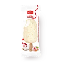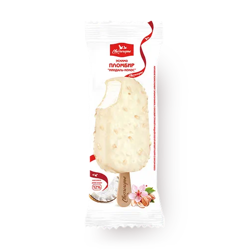 Пломбир в глазури со вкусом кокоса дополняют стружка кокоса и дроблёный миндаль. Его можно съесть отдельно или использовать в качестве десерта.