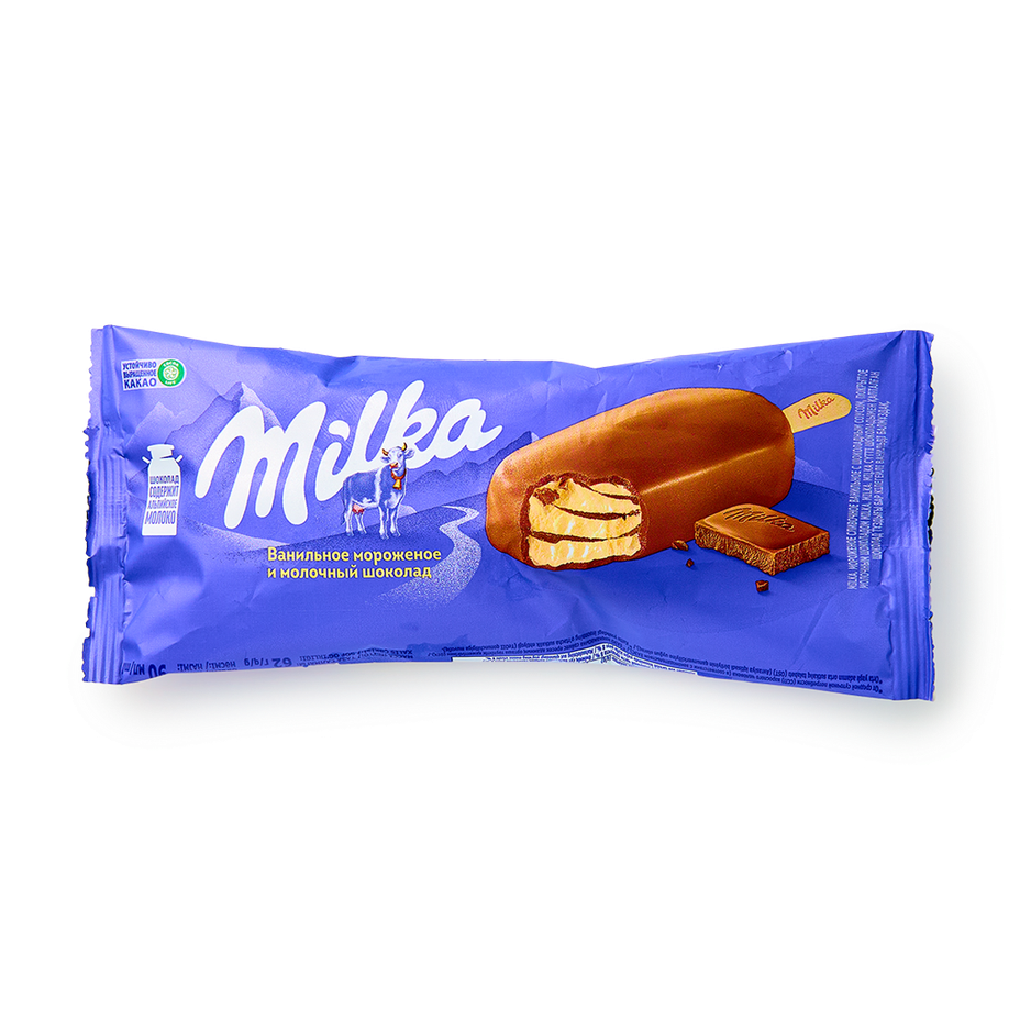 Невероятно нежное ванильное мороженое с кусочками стручков ванили и тонкой хрустящей прослойкой шоколада Milka внутри, покрытое молочным шоколадом Milka, тающим во рту!