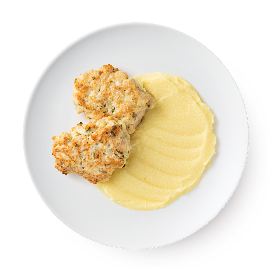 Куриные оладьи с нежным картофельным пюре готовы к разогреву. В них сочетаются сочность мяса и сливочный вкус гарнира.