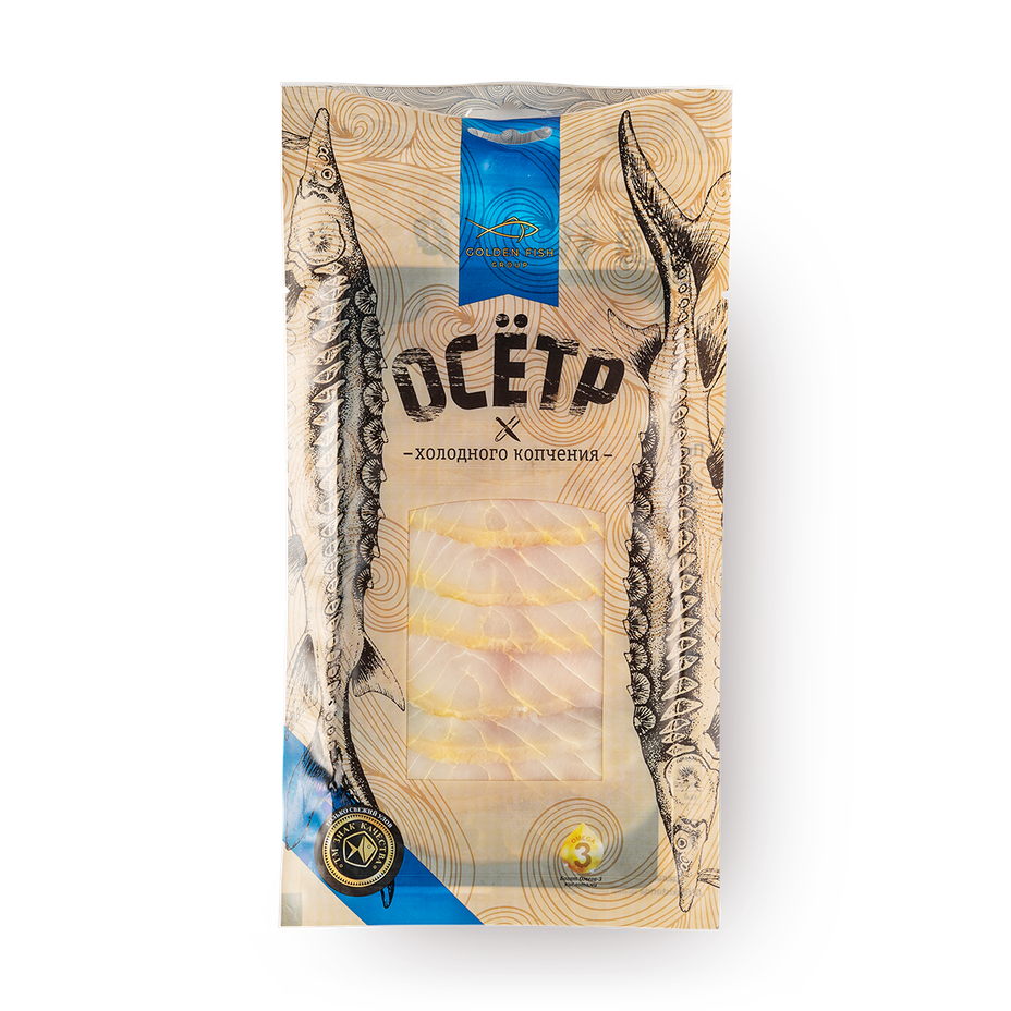 Ломтики осетра холодного копчения с нежным вкусом и лёгким дымным ароматом. Можно добавить в салат или подать в качестве закуски.