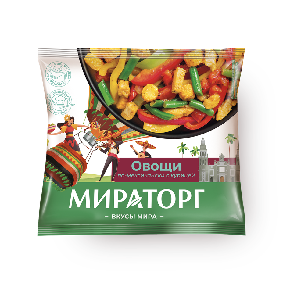 Томаты, фасоль стручковая, лук, перец сладкий, филе куриной грудки, кукуруза, мексиканский соус (перец красный гриль, чеснок, лук, кориандр, томатная паста, тмин, красный перец чили, порошок семян кориандра, луковый порошок, орегано, порошок копченой паприки, соль, сироп агавы, сок лайма, порошок паприки, корица), соус томатный (вода, томатное пюре, масло, чеснок, оливковое масло, желатин, базилик, сахар, соль, петрушка, загуститель, фенхель, белый перец). На предприятии используют - ся продукты переработки рыбы, ракообразных, моллюсков, молока, сои, горчицы и сельдерея.