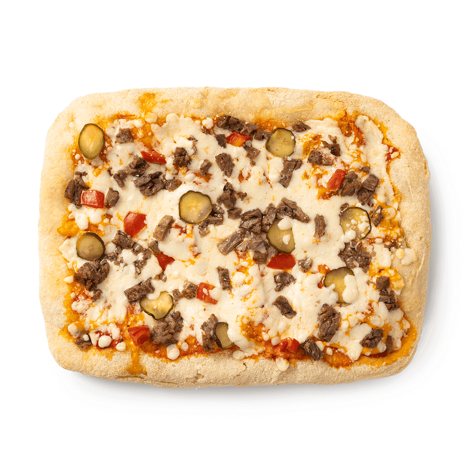 Эта пицца с говядиной и маринованными огурцами сочетает сочность мяса с лёгкой кислинкой. В ней есть томатный соус и моцарелла, которые придают насыщенность вкусу.