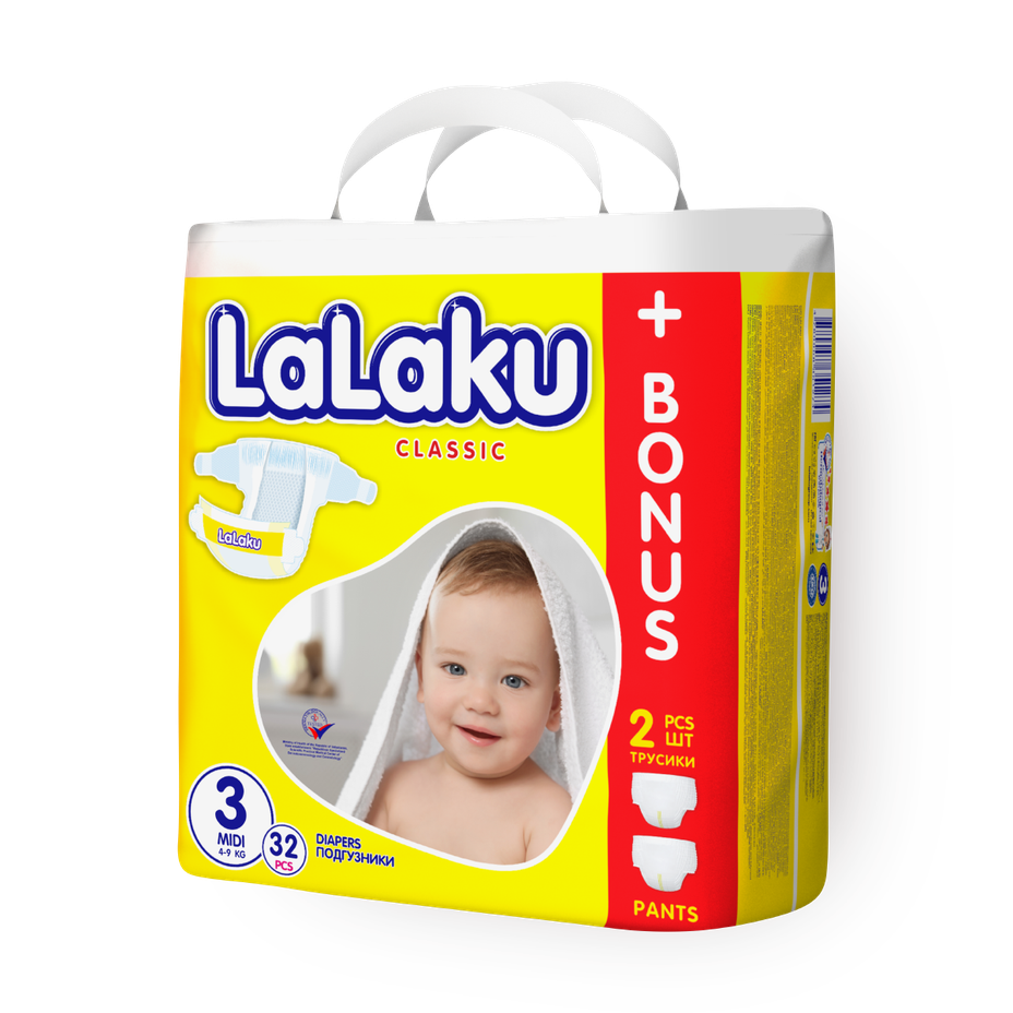 Эти подгузники подходят для малышей весом от 4 до 9 кг. В упаковке 32 штуки, которые удобно менять в любое время.