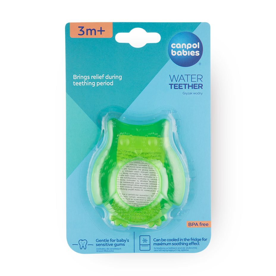 Этот силиконовый прорезыватель с водой помогает малышам при прорезывании зубов. Его удобно держать в руках, а охлаждённый вариант снимает дискомфорт.