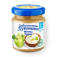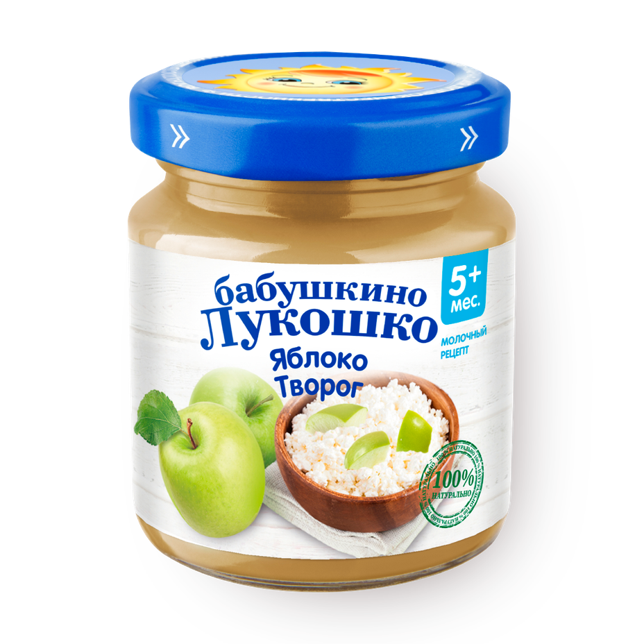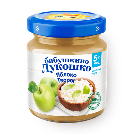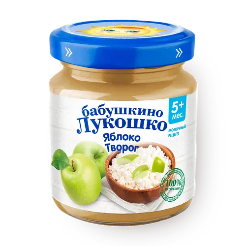 Это пюре сочетает яблоко и творог с добавлением рисовой муки. Оно подходит для малышей с 5 месяцев и готово к употреблению.