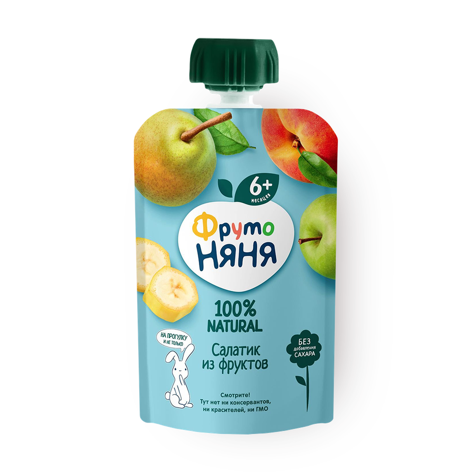 Пюре из бананов, груш, яблок и персиков подходит для малышей с 6 месяцев. Его удобно взять с собой или использовать в качестве перекуса.