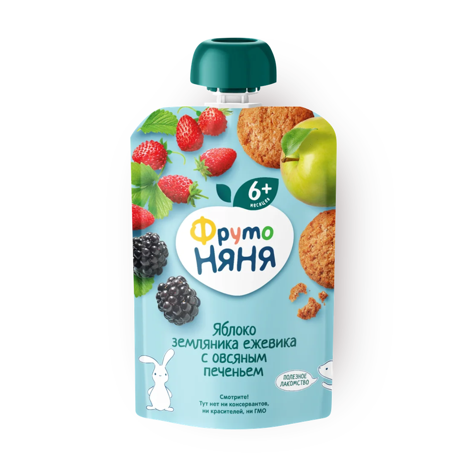 Пюре сочетает яблоки, землянику и ежевику с кусочками овсяного печенья. Оно подходит для детей с 6 месяцев и готово к употреблению.