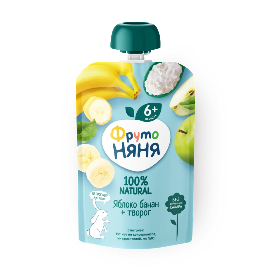 Пюре из яблок, пюре из бананов, творог, сок яблочный концентрированный. Без добавления сахара.