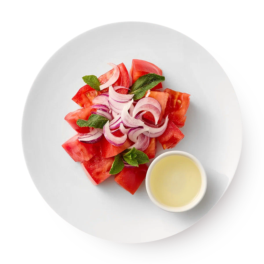 Салат из свежих томатов и красного лука с подсолнечным маслом. Можно подать к мясу или есть в качестве лёгкой закуски.